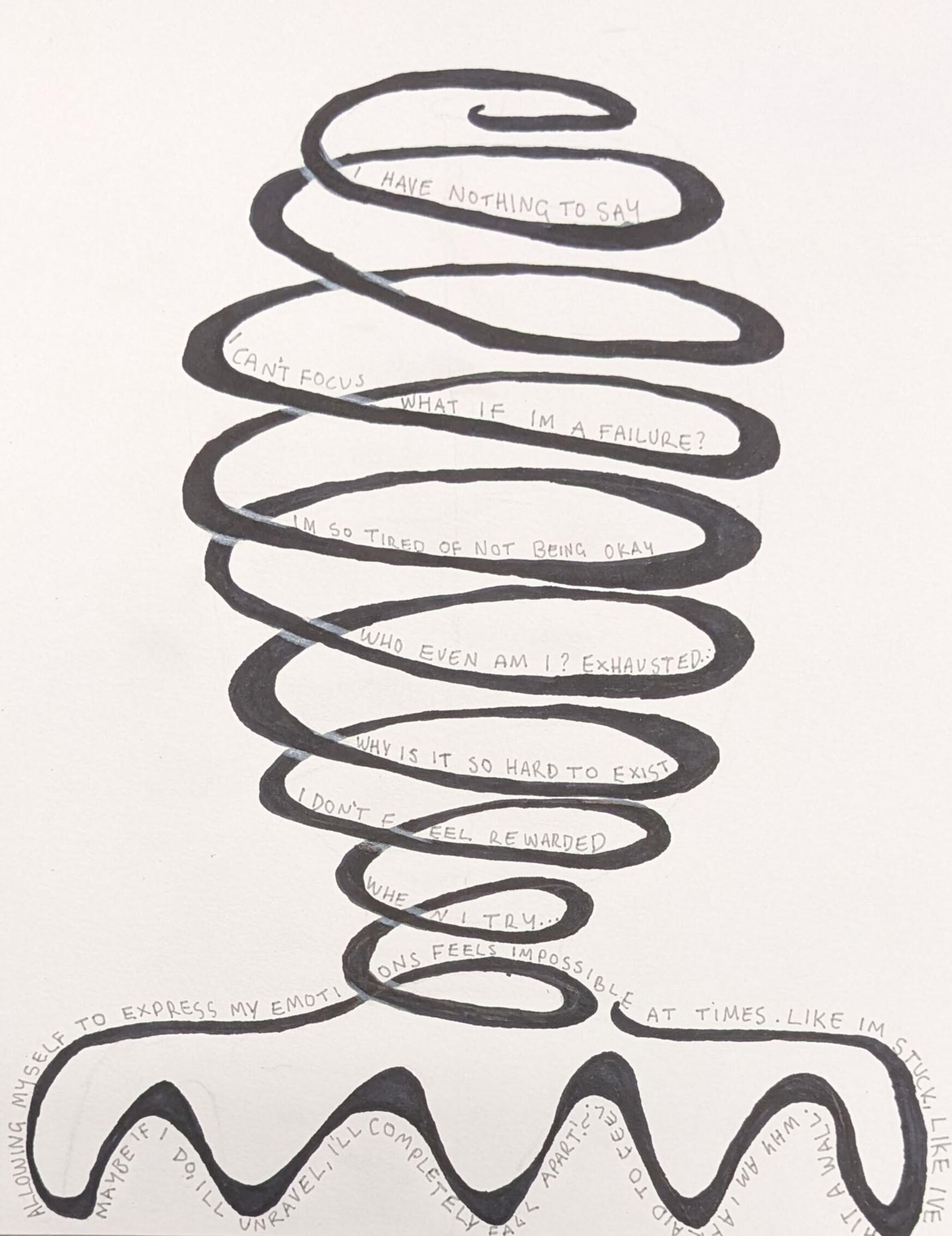 Your community of people who live through similar internal battles as you.Near the start of each session, we do a quick (~5 minute) mindfulness "wiggle" to de-escalate, starting with breathing and working through stretches. Then we get to creating!We have themed projects each term that will tie into the annual exhibition. These are discussed and decided by the whole group. We work through a meditative drawing together process that opens conversation and supports the expression of the complex symptoms and emotions associated with living with long term mental health related disabilities.Occasionally we have experimenting days where we try out new materials and mediums, share techniques and basically have the best free play ever! You can work on... well, whatever you feel like! The focus is on the themes for the exhibition, but if you just want to hang out and create that’s perfectly ok!There are a lot of emotions and "vibes" that can fill the room at any stage. It's common for topics based around our personal experiences to come up, and we recognise this may be triggering for some people. Feel free to create space for yourself and/ or ask for emotional support, if need be. All that we ask is nothing that's said gets shared outside our room.Note: Before the end of your first session, there will be a participation form for you to fill out when you're able, containing questions such as your name and pronouns, how best to contact you, and how we can support you.• Antifragile is NOT therapy. Antifragile is NOT a service.